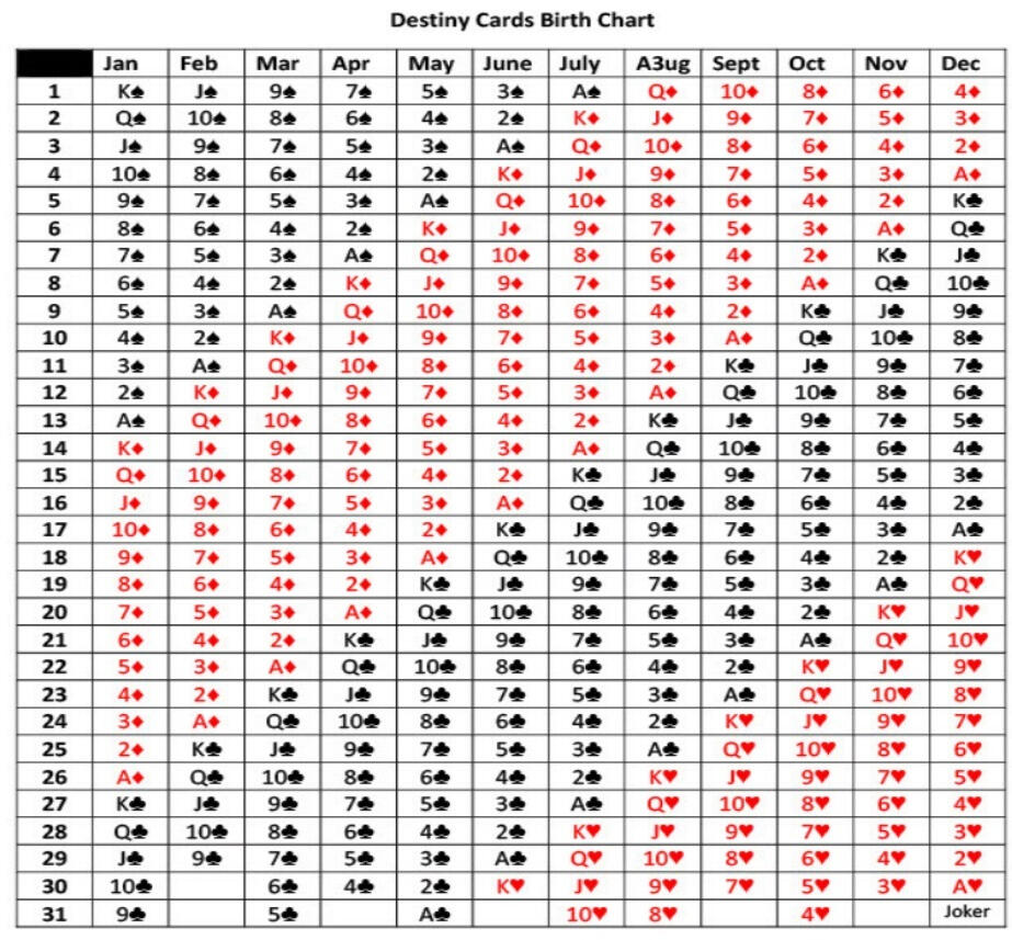Every day of the year has it's corresponding card. Through it's Number and suit-you can begin to "Enlighten" yourself with who you are. Here is the list with each day and it's card (see chart at the top right of this page).