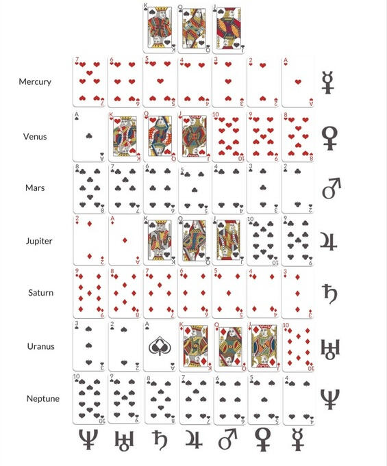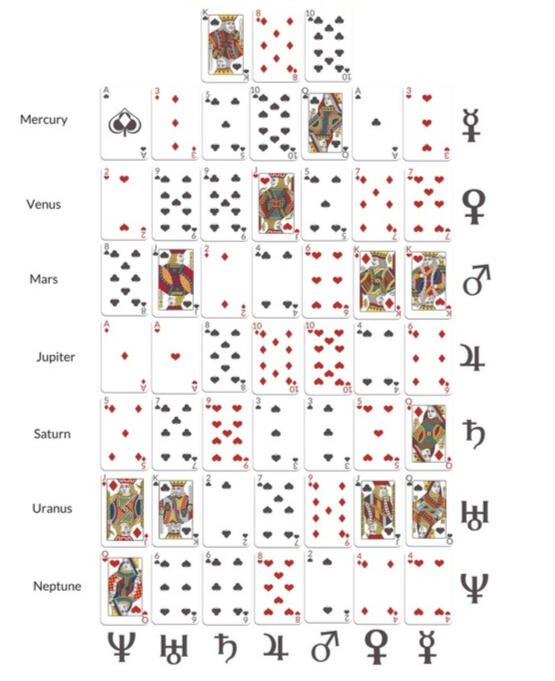 They are both 7 across and 7 down and each spot on the spread is ruled with 3 on the top center which is the "Crown Line"-we'll get to that later. Like I said before, the Creators plan for man is always perfect and harmonious. It's always something the Man can rely on. The perfect order of the cards is hearts, clubs, diamonds and spades. Can you guess what the very first card on the top line of 7 (that magical number) cards starts with? (see graph in the middle of this page)...you guessed it-the Ace of Hearts-they go from right to left-followed by the 2 of Hearts thru the 7. That first horizontal line is governed by the first planet Mercury (the matching symbols for each planet is to the right and bottom-get to know these symbols without the names). The next line of 7 horizontal cards continues on from the 8 of Hearts to the A of Clubs-the first card in the next suit-you see we went all the way from the Ace of Hearts to the K of hearts then to the Ace of the next suit. This second line is governed by Venus and it's energies. So you continue on like this to the 3rd line which is governed by Mars; the 4th line governed by Jupiter; the 5th governed by Saturn; the 6th governed by Uranus; and the last or 7th line governed by Neptune of which the last card in that line ends up being the 10 of Spades.